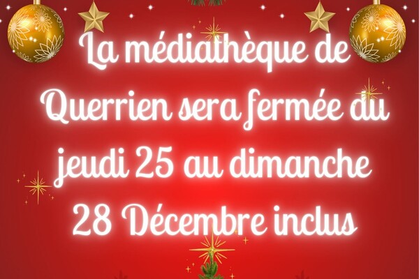 Querrien - Fermeture de la médiathèque Ouvrir le panel d'outils Imprimer Querrien Afficher les options de partage × Partager La Médiathèque de Querrien sera fermée du jeudi 25 au dimanche 28 décembre inclus