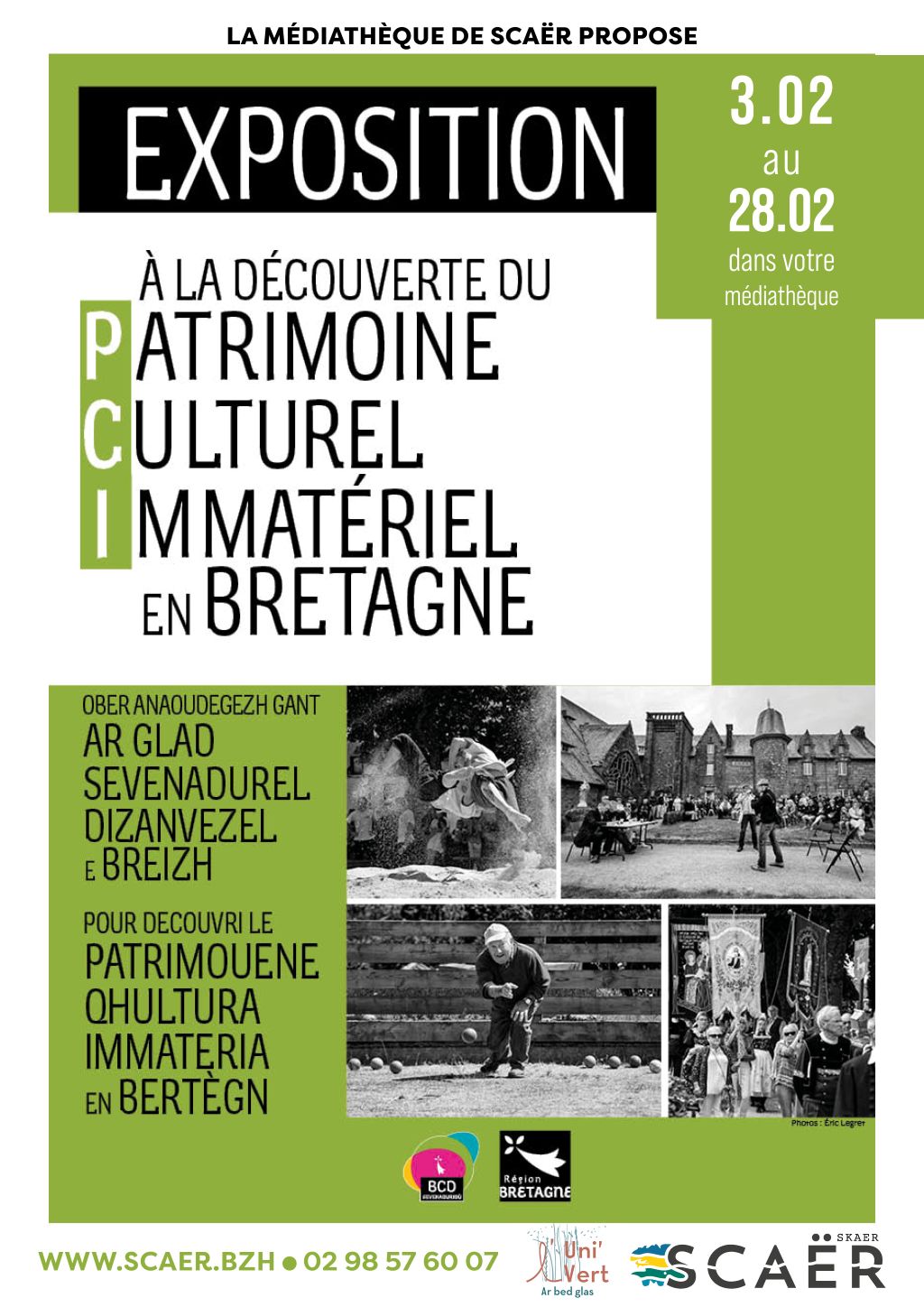 Découvrez à la médiathèque une exposition de l'assocation Bretagne Culture et Diversité en partenariat avec l'association Carnaval à l'Ouest. Cette exposition trilingue est consacrée aux différents domaines du Patrimoine Culturel Immatériel : musique, danse, conte, jeux, sports...