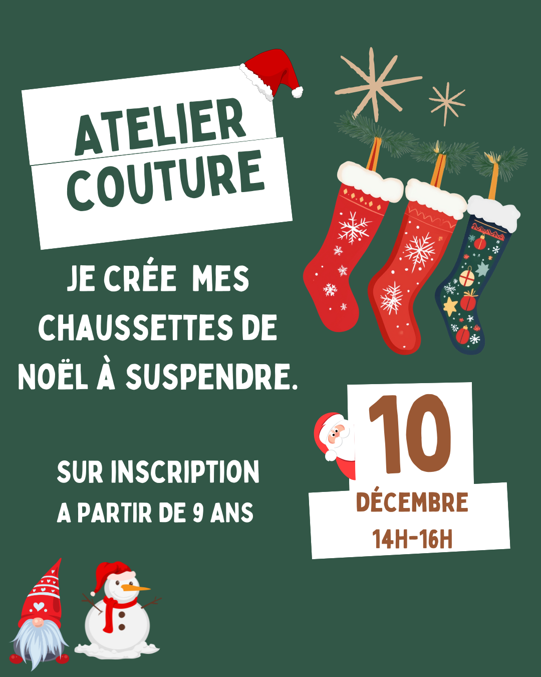 BAYE-Atelier couture -Noël Afficher les options de partage × Partager Atelier couture, Confection de chaussettes de Noël à suspendre. Catégorie Atelier Tags Baye Détails des prochaines sessions Le mercredi 10 décembre 2025 de 14:00 à 16:00 Condition d'accès Sur inscription. A partir de 8 ans Public Enfants Lieu Baye