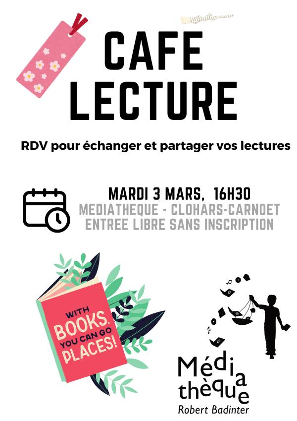 Kloar - Café lecture Afficher les options de partage × Partager RDV entre lecteurices pour échanger sur vos dernières lectures et partager vos coup de cœur ! Catégorie Cafés rencontres Tags Clohars-Carnoët Détails des prochaines sessions Le mardi 03 mars 2026 de 16:30 à 18:00 Condition d'accès Entrée libre, sans inscription Public Adultes Lieu Clohars-Carnoët Le mardi 05 mai 2026 de 16:30 à 18:00 Condition d'accès Entrée libre, sans inscription Public Adultes Lieu Clohars-Carnoët
