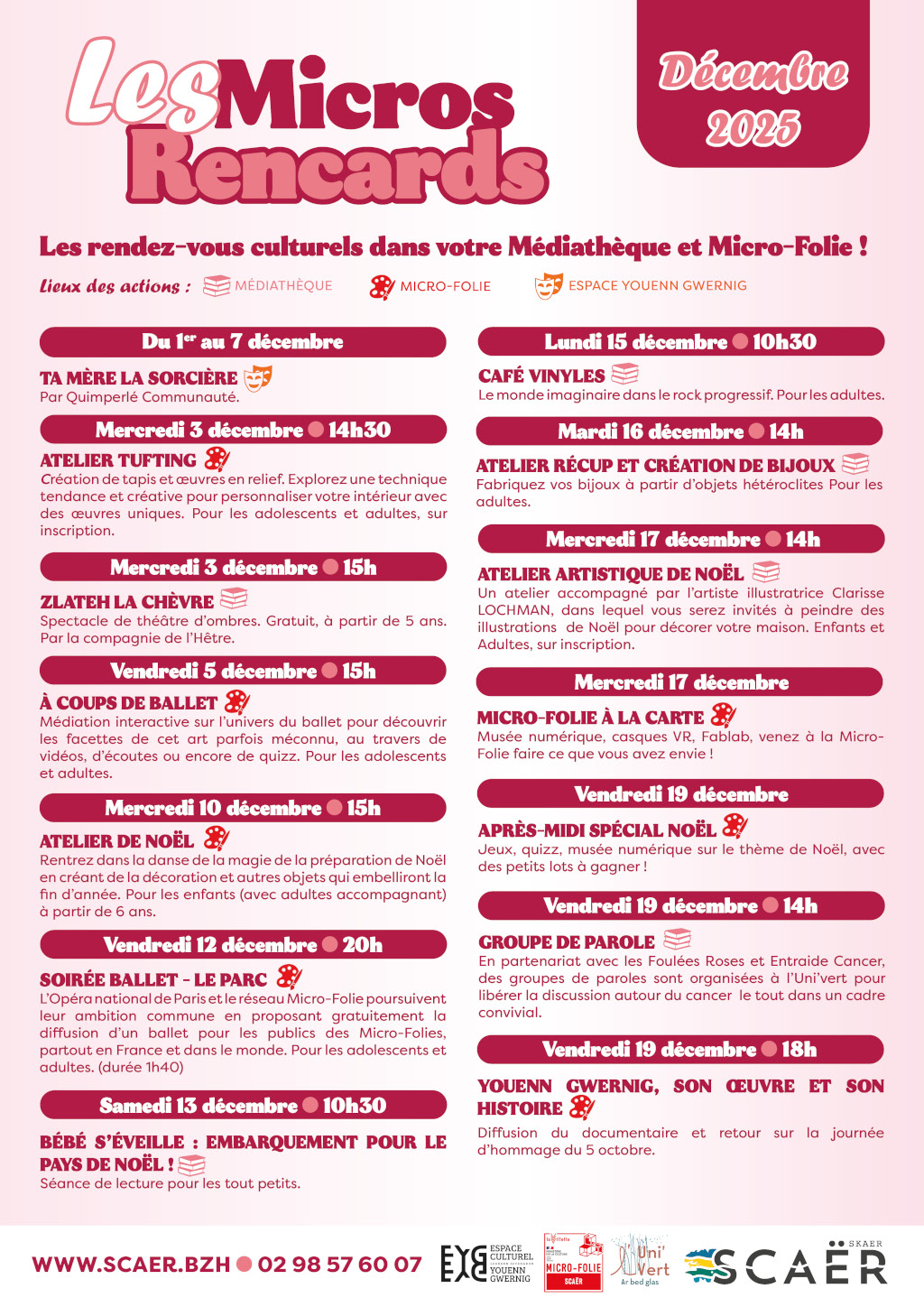 Bienvenue à l’Uni’Vert ! L’Uni’Vert est une médiathèque de 500 mètres carrés, qui a ouvert ses portes fin 2022. Ce lieu se veut chaleureux et accueillant. Il propose des collections diversifiées avec en bonus un espace dédié à la ruralité positive et un espace musique avec une offre de vinyles.Des ateliers et expositions ouverts à tous sont proposés régulièrement pour valoriser les collections.Associé au service culturel de la ville, l’Uni’Vert fonctionne en partenariat avec la Micro Folie Fablab de Scaër pour construire une offre culturelle cohérente sur la commune.L’été l’Uni’Vert accueille l’office de tourisme Quimperlé les Rias, la médiathèque bénéficie aussi du Label vélo de la Région Bretagne.